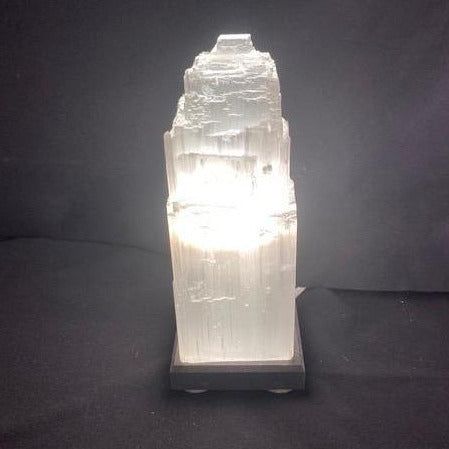 Der Selenit erhebt sich hier in Form einer kleinen „Lichtburg“ mit stufenartiger Struktur, die wie eine von der Natur geschaffene Kristallpyramide wirkt. Sobald die Lampe erstrahlt, entfaltet das Marienglas seinen sanften Glanz und füllt den Raum mit einer friedlichen, klaren Schwingung.