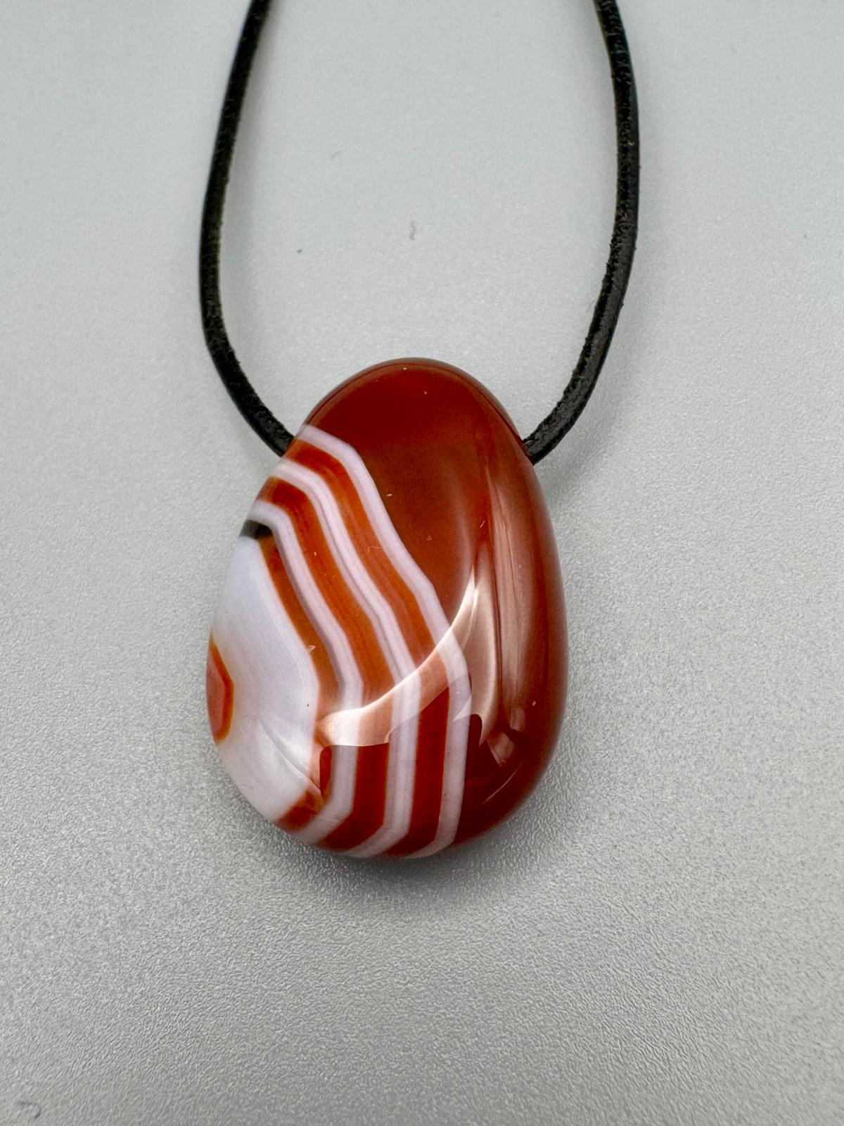 Die Oberfläche ist glatt poliert und bringt die charakteristischen Achatschichten besonders schön zur Geltung. Durch die seitliche Bohrung lässt sich der Anhänger direkt an einem Lederband oder einer Kette tragen. Die Tropfenform unterstreicht die fließende, sanfte Ausstrahlung des Steins.