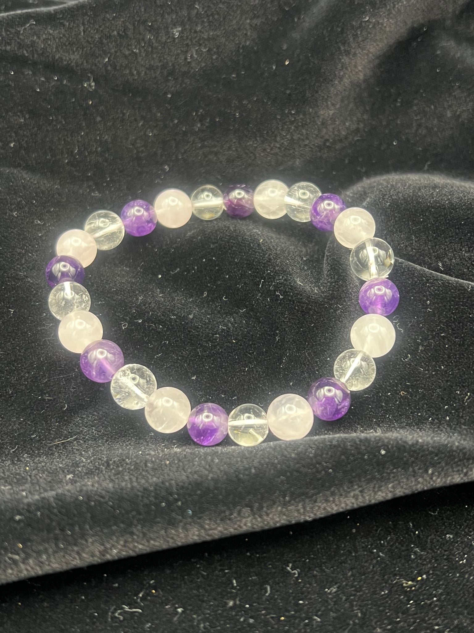 Dreiklang-Armband aus Amethyst, Rosenquarz & Bergkristall – Harmonie, Herzenskraft und Klarheit