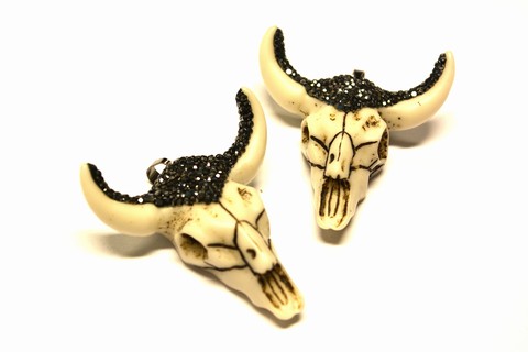 xAnhänger „Büffelkopf“ aus synthetischem Knochen, weiß mit schwarzen Strasssteinen