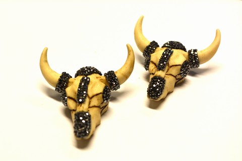 xAnhänger „Büffelkopf“ aus synthetischem Knochen, weiß mit schwarzen Strasssteinen