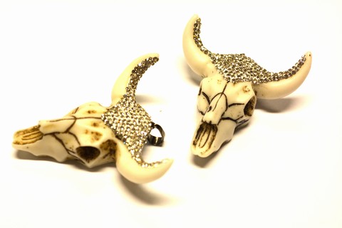 xAnhänger „Büffelkopf“ aus synthetischem Knochen, weiß mit silberfarbenen Strasssteinen