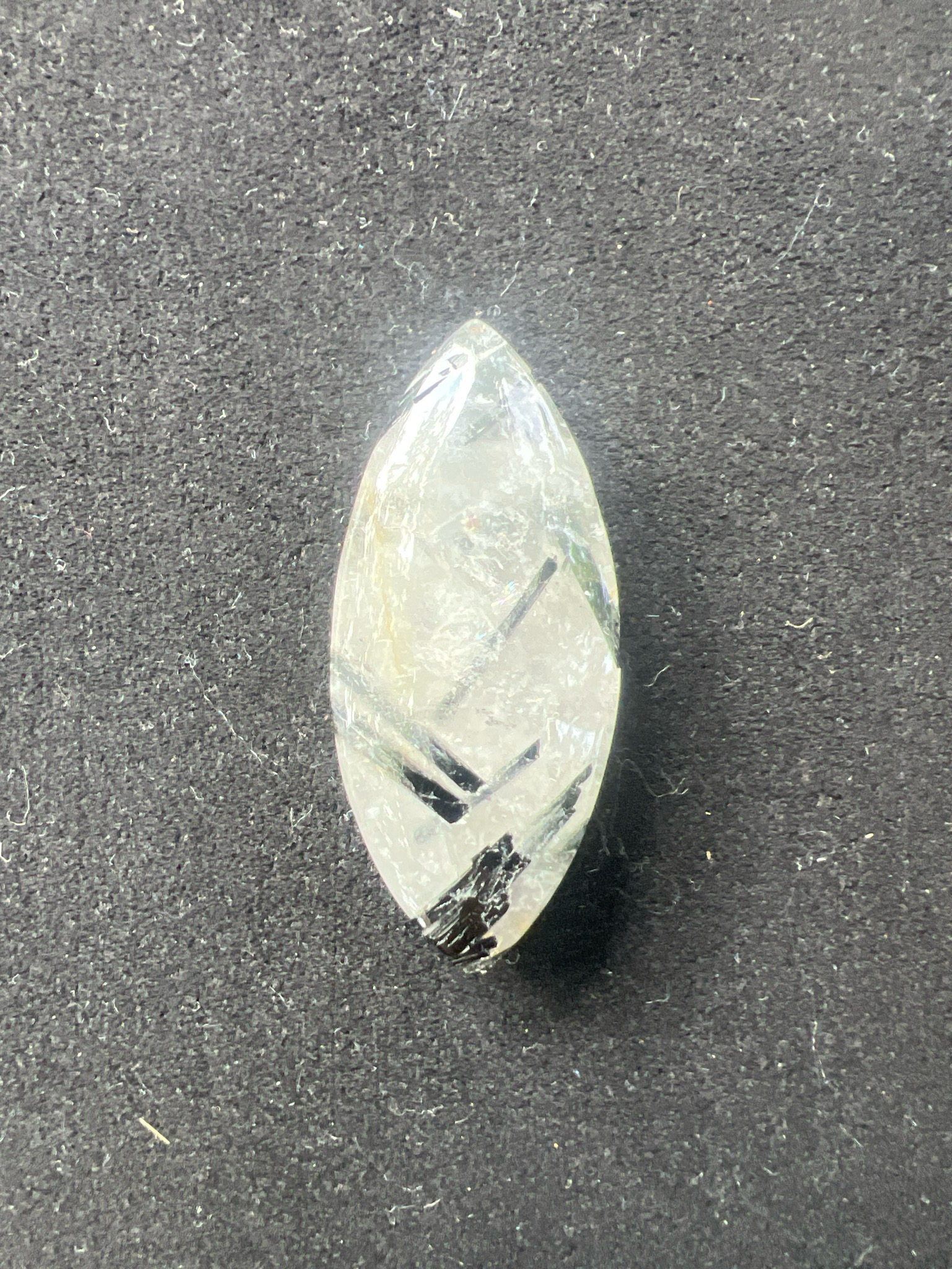 Der Turmalinquarz in Navette-Form (ca. 4 cm) vereint die Klarheit des Bergkristalls mit den schützenden Einschlüssen von schwarzem Turmalin. Die markanten schwarzen Nadeln, die sich wie feine Linien durch den durchscheinenden Quarz ziehen, machen jedes Stück zu einem faszinierenden Unikat. Mit Bohrung versehen, eignet er sich ideal als Anhänger oder für kreative Schmuckprojekte.