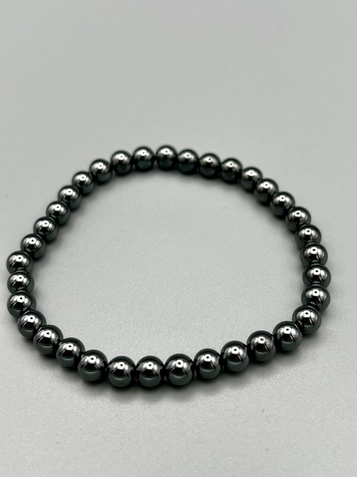 Dieses elegante Armband besteht aus polierten Hämatit-Perlen (ca. 6 mm), die mit ihrem metallisch-schimmernden Glanz sofort ins Auge fallen. Der Hämatit ist ein traditioneller Stein der Erdung, der Körper, Geist und Seele ins Gleichgewicht bringen soll.