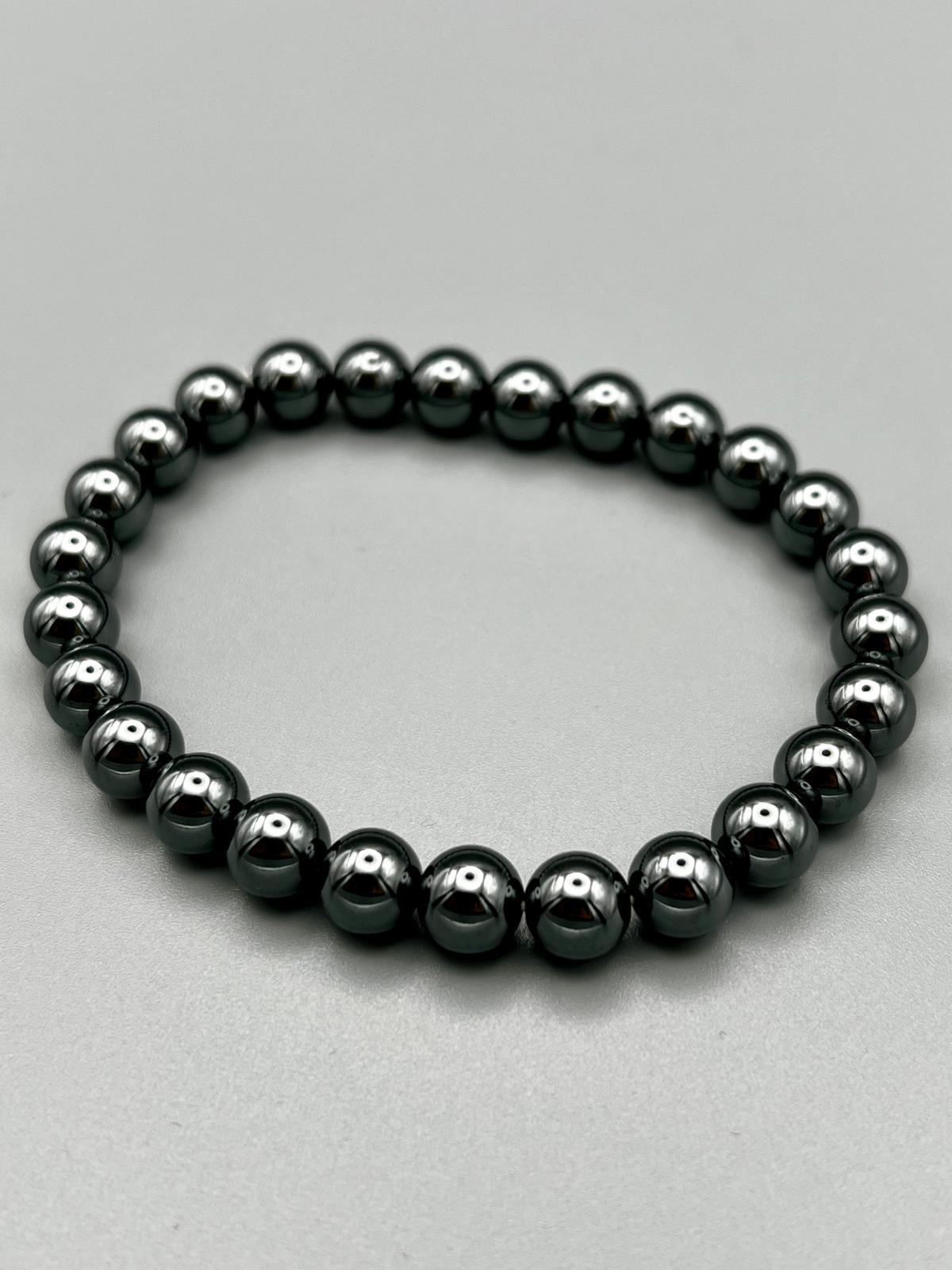 Dieses elegante Armband besteht aus polierten Hämatit-Perlen (ca. 6 mm), die mit ihrem metallisch-schimmernden Glanz sofort ins Auge fallen. Der Hämatit ist ein traditioneller Stein der Erdung, der Körper, Geist und Seele ins Gleichgewicht bringen soll.