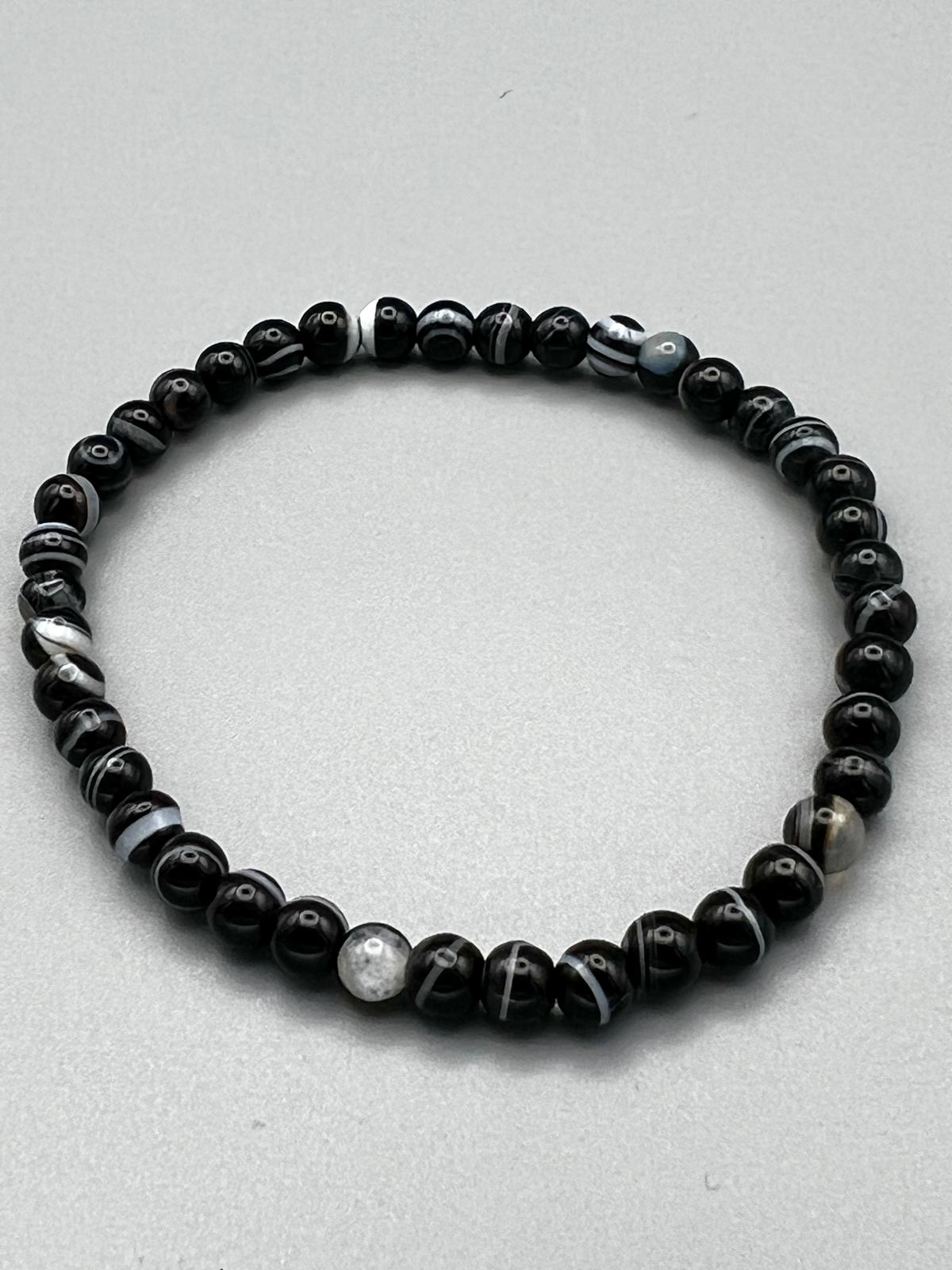 Dieses elegante Armband aus Botswana Achat-Perlen verbindet dunkle und helle Linien zu einem harmonischen Muster. Jeder Stein ist ein Unikat, das die Schönheit der Natur widerspiegelt.