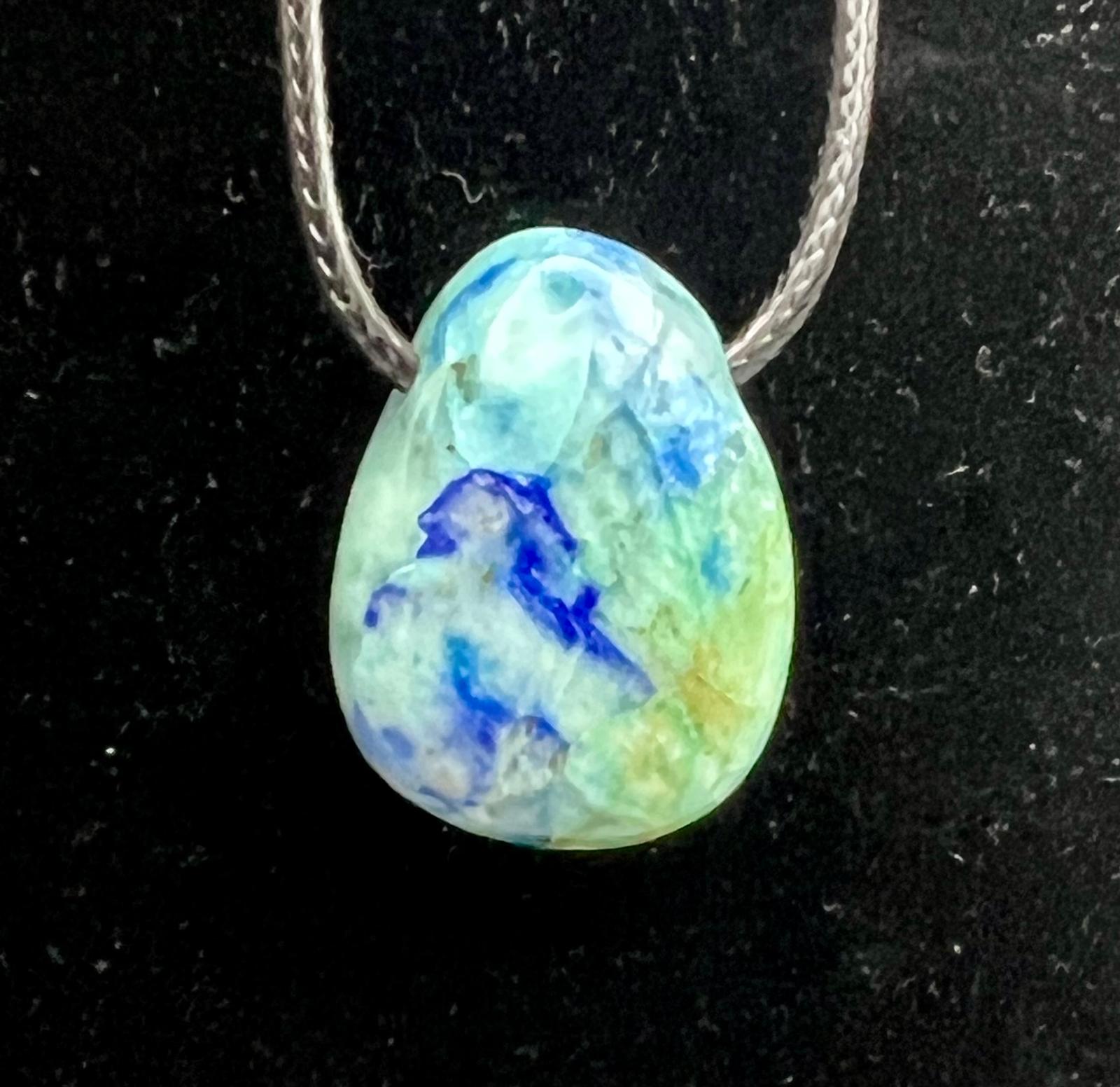 Dieser faszinierende Azurit als gebohrter Kettenanhänger zeigt ein intensives Farbspiel aus tiefem Blau, zarten Grüntönen und sanften, erdigen Strukturen. Seine natürliche Zeichnung erinnert an Landschaften, Himmel und Meer – ein kraftvolles Unikat der Natur, handverlesen und voller Magie.